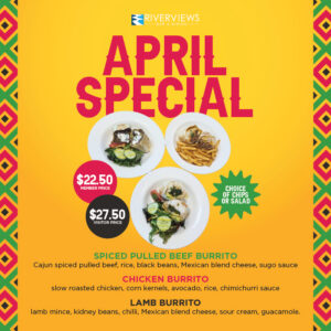 Spice up your month with our delicious burritos at Riverviews Bar & Dining! Choose from: Spiced Pulled Beef, Chicken or Lamb. All served with your choice of chips or salad 🙌