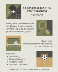 Working Adults in the Macquarie Park Ryde Business District are invited to North Ryde RSL to skip the traffic and get active after work through sport.