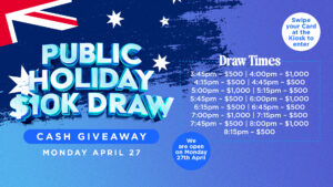 💸 $10,000 Cash Giveaway 📅 Monday April 27 ⏰ Draws every 15 minutes from 3:45pm 🎟️ Enter via kiosk swipe