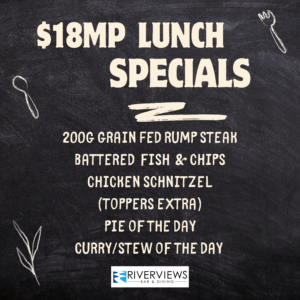 Enjoy a delicious variety of affordable meals with Riverviews Bar & Dining’s $18* Lunch Specials—available every day! Choose from mouth-watering options like 200g grain-fed rump steak, battered fish & chips, classic chicken schnitzel (with optional toppers), the pie of the day, or a hearty curry/stew of the day. Perfect for your midday meal with unbeatable value and flavour.