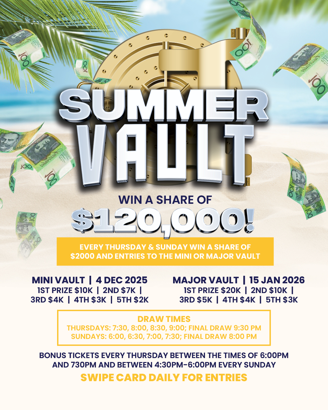 Get ready for the Summer Vault and your chance to win a share of $120,000 in cash prizes! Every Thursday and Sunday, you could win a share of $2,000 and gain entries into the Mini Vault and Major Vault draws. The Mini Vault draw happens on 4 December 2025 with a top prize of $10,000, while the Major Vault draw takes place on 15 January 2026 with a massive $20,000 first prize!